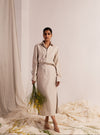 This coord set has a linen shirt with a classic collar, front button opening, and full sleeves with cuffs. The matching pencil skirt has side and back slits and a front button opening with elasticated back, offering a stylish and comfortable fit.